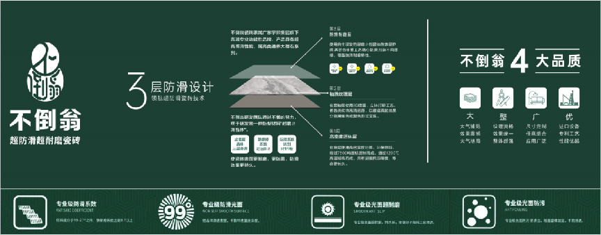 作为高端功能性瓷砖的代表,不倒翁防滑瓷砖始终聚焦消费者需求与产品品质,匠心智造每一片瓷砖,致力于为万千家庭提供安全健康的绿色环保建材。